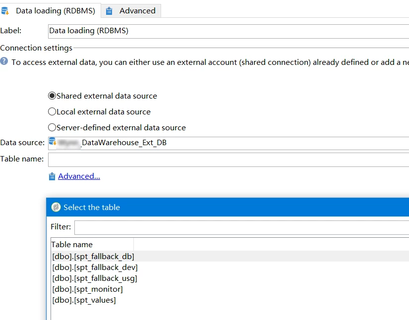 In the workflow, when we want to use this external account for data loading by RDBMS, table list can not be shown completely.