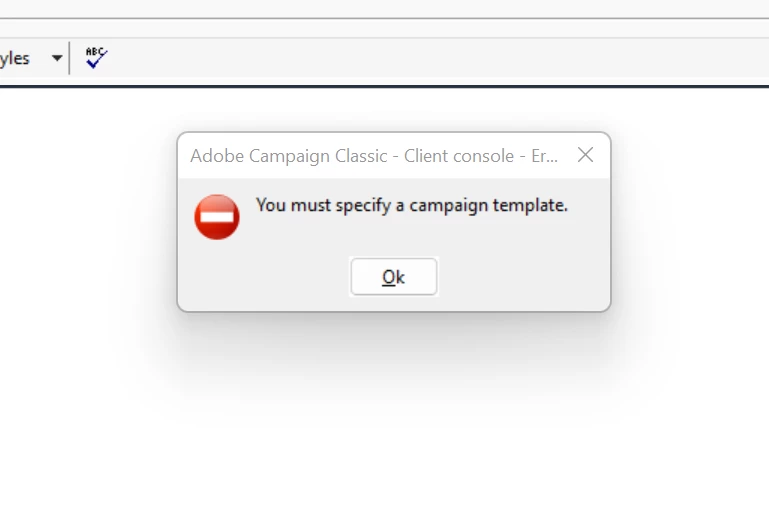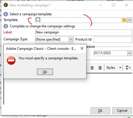 You will be getting this error, when you try to create a new campaign by not selecting 'campaign template'