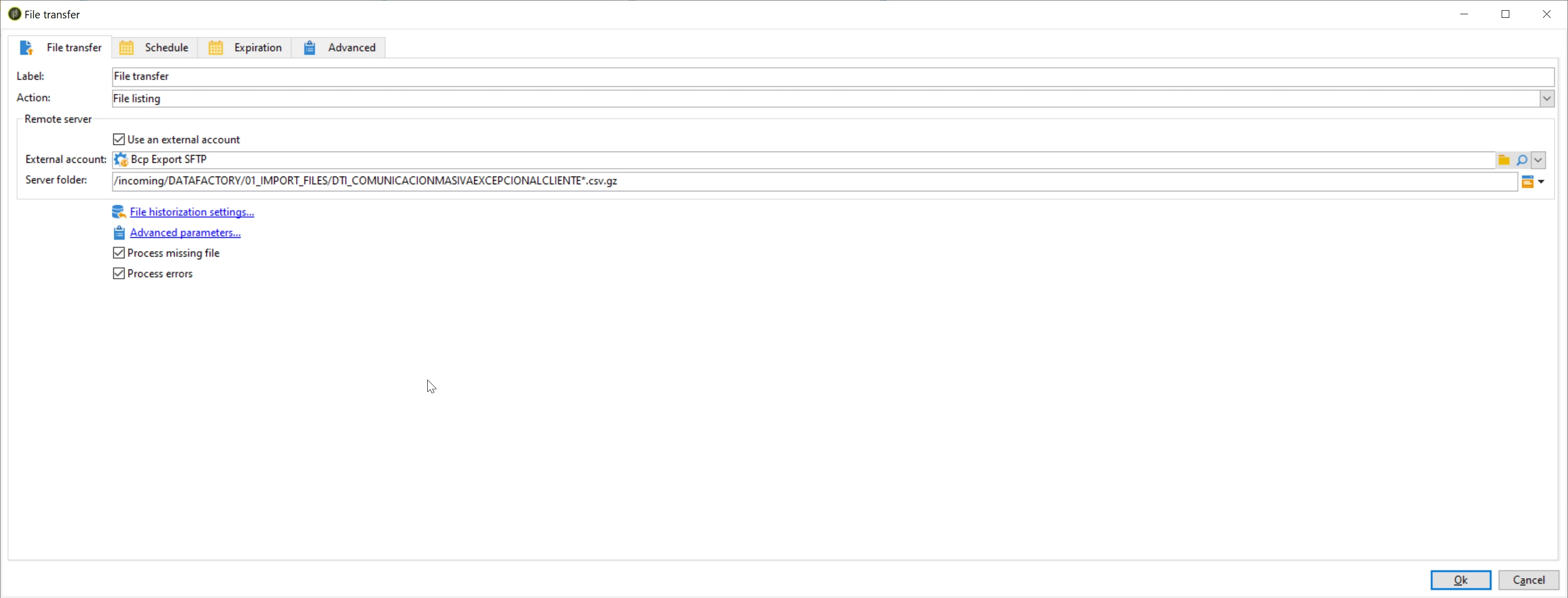 In the server folder, I'm using (regex) : 01_IMPORT_FILES/DTI_COMUNICACIONMASIVAEXCEPCIONALCLIENTE*.csv.gz