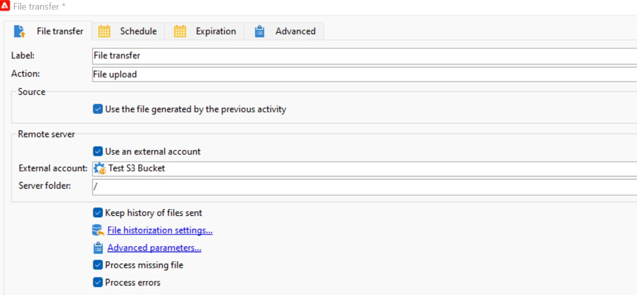 i have created an external account for S3 bucket using Server Url, AWS Access ID, AWS Secret Access Key and AWS Region. While i am trying to upload a sample file using file transfer activity for the first time i am getting the below error.