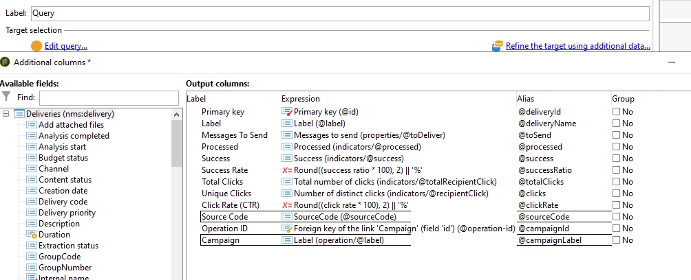 Start the query activity with Deliveries and specify the criteria to pull and add additional data to include the OOTB metrics and calculated metrics you want to include in the report. You could do the calculations within the additional data section to get the data that you need to include in the report.