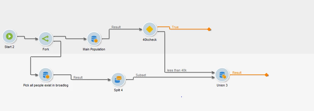 4. If counts are less than 40k, then use one more query activity which will run in parallel using fork activity and from there you can pick the people whose broadlog exist and then using split to sort the population on basis of event date and then do union with actual population.