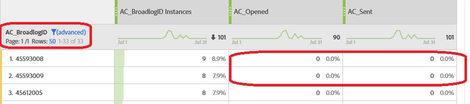 But when I am trying to create the same table for BroadlogID (BID) then all broadlogID values are set to 'Unspecified' or the metrics value is set to '0'.