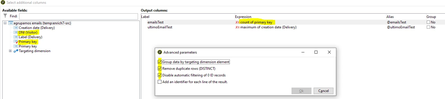 For example, in this case it groups the emails sent for each request (the key is request) and checking the boxes that I indicate. But how can I group by another variable, for example DNI?