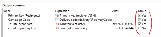I have checked from broadlog schema, and unable do expression group by using count of Delivery label.