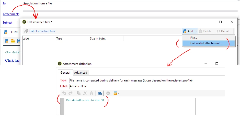 Attachment > Add > calculated attachment > Type: File name is computed during delivery for each message