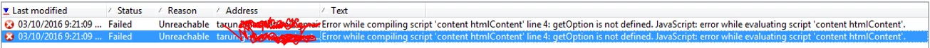 03/10/2016 9:21:09 AM Failed Unreachable xxxx@yyy.com Error while compiling script 'content htmlContent' line 4: getOption is not defined. JavaScript: error while evaluating script 'content htmlContent'.