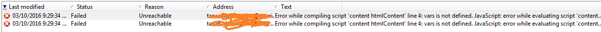 03/10/2016 9:29:34 AM Failed Unreachable xxxx@yyyy.com Error while compiling script 'content htmlContent' line 4: vars is not defined. JavaScript: error while evaluating script 'content htmlContent'.