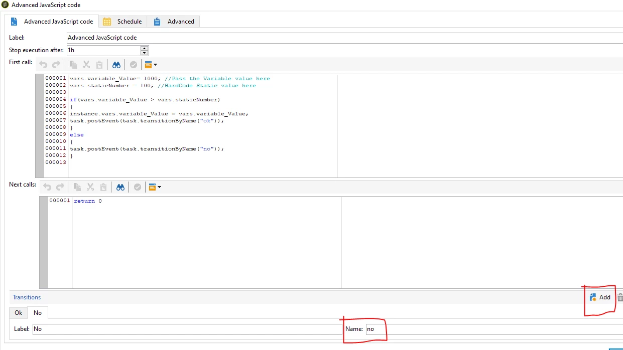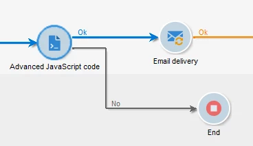 I have used Javascript code to make a functional call using API. I have stored that value in a variable. Now, I'm trying to use the value to check if the value of variable is greater than static value and if yes, I want to go ahead in further step in workflow. If not, I want to end the workflow.