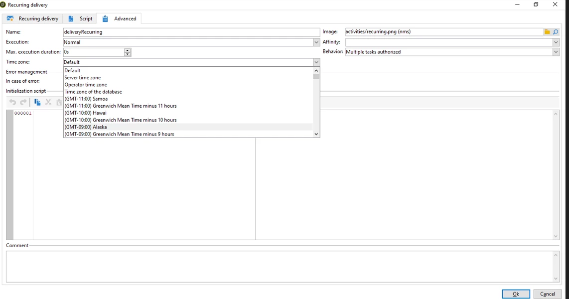 Also, Please select the timezone required in the Reccuring Delivery by Opening it and go to Advanced Tab and then select the required Time zone as shown below: