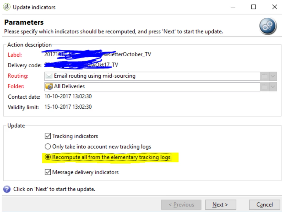 To fix this, select the concerned delivery in the Adobe Campaign Explorer, right-click and choose Action>Recompute delivery and tracking indicators. Select the highlighted option, Click Next, then click Finish.