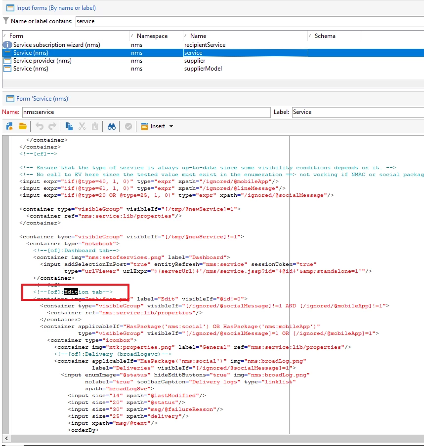 I am extending the nms:service schema with a few elements, and wish to include them in the service input form as well, but I am not able to locate any of the forms associated with service & subscriptions. For reference, the form has 3 tabs; "Dashboard", "Edit", and "Subscriptions", and I am primarily looking for the "edit" one. Any tips are very welcome!