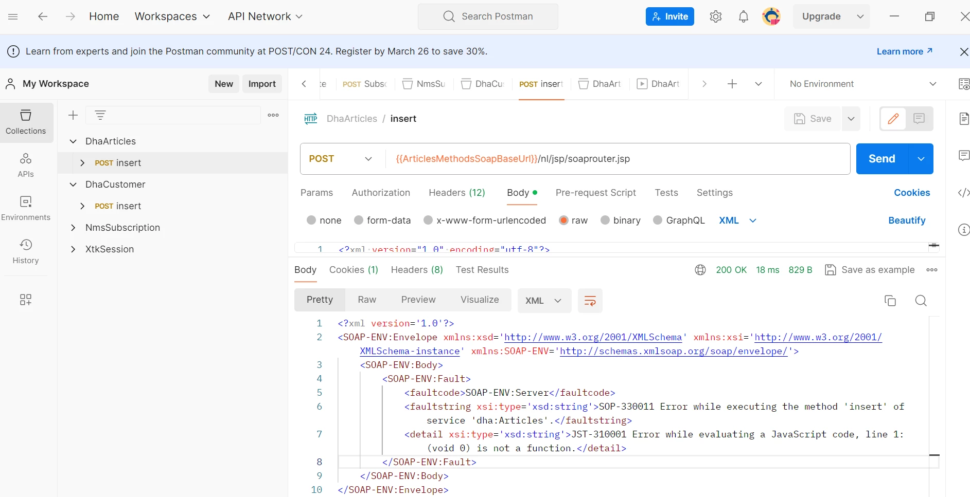 I got an error while inserting data into a custom schema using the Postman application.