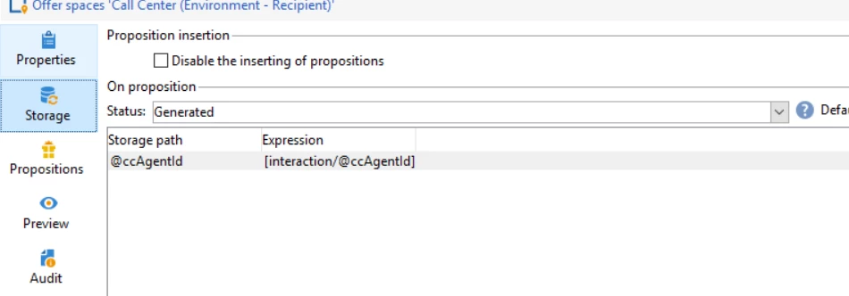 After making the changes in interaction and proposition schema, I updated the offer space as below to store the ccAgentId sent via the propose method
