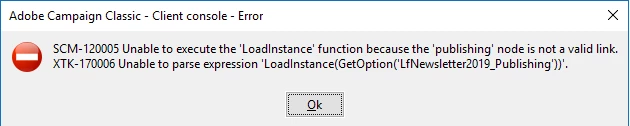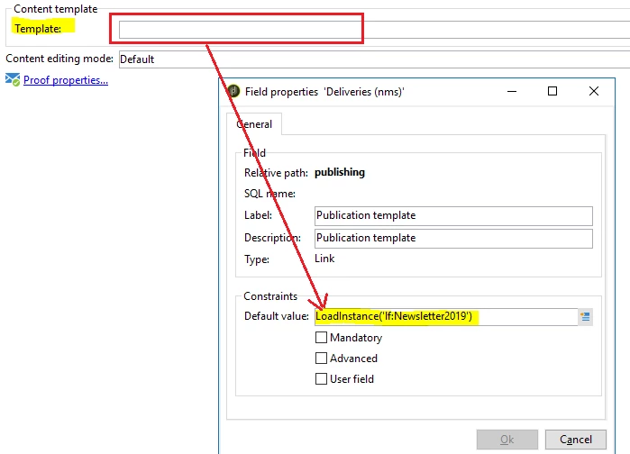 1. I'm declaring the name of the publication template "lf:Newsletter2019" in an Option and using LoadInstance() function to load in the input field when I click on create New Delivery button in Delivery templates.
