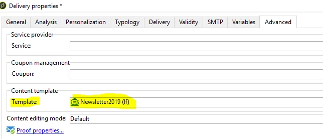 3. Strangely, I was able to make the Newsletter2019 as default when I click the New Delivery template button. But, I was nable to see the name(as in the first screenshot) in the Template input field as below