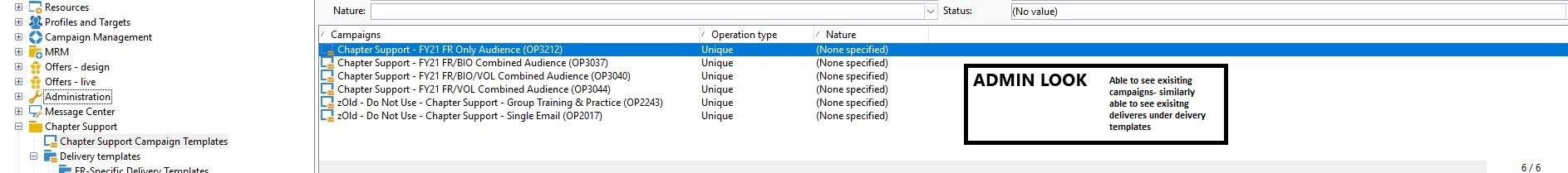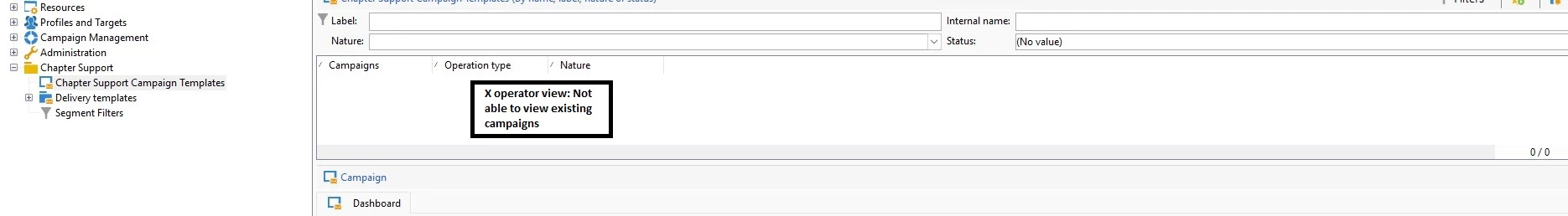 Not able to see the existing delivery templates and campaigns for other "non-administration right" operator