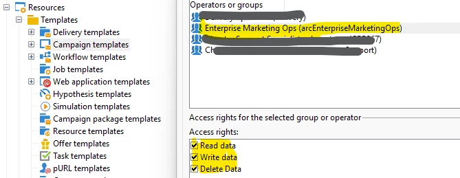 Query: Have to create an operator group "X" which has all the named rights except "Administration". I have provided the same but the issue is the new user under "X" group is not able to see the delivery templates/campaigns which are already present in the respective folders.