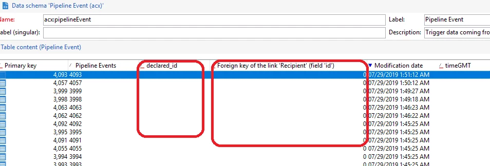 I can see that the Trigger Event data is flowing to PipelineEvent schema in Adobe campaign but the columns DeclaredID and RecipientID are blank and '0' respectively.