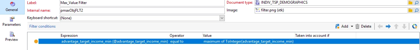 I am trying to build one predefined filter for max(value) for each household, same thing I have achieved through QUERY process box, where I am utilising the Aggregate functions and doing group by on Household key. Now when I am trying to achieve the same through predefined filter I am not sure how exactly I can achieve, I am doing something like below but then questions comes for how to do group by.