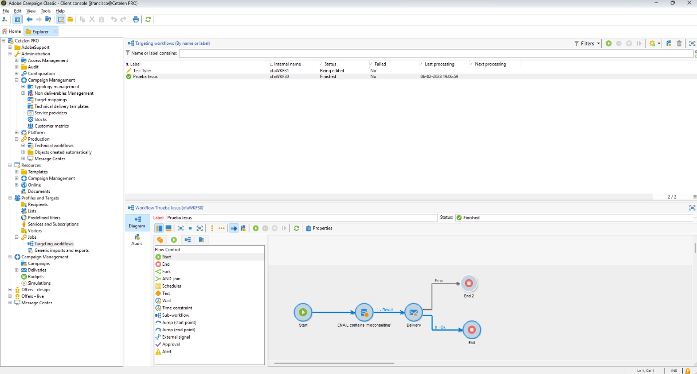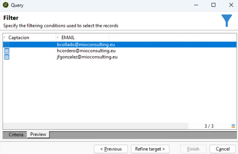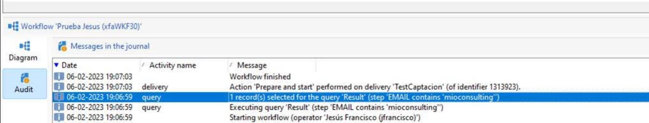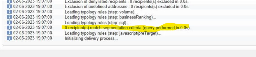 I am trying to understand why when doing a targeting workflow, in which a super-simple query is made (email contains mioconsulting), and later an attempt is made to create a delivery, no recipient is found.