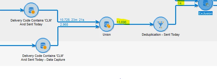 I'm having an issue whereby the data flowing out of a Union is acting strangely. I'm querying recipient delivery logs table (one the out of the box one, the other being a custom one) and bringing in the delivery code on both before going into a Union. The number that comes out of it is correct, combines both of the queries totals, but when you interrogate the data using 'Display The Target' it is only displaying the primary set data. Then I put it through a deduplication to get unique delivery codes but it is only giving me the number of the primary data.