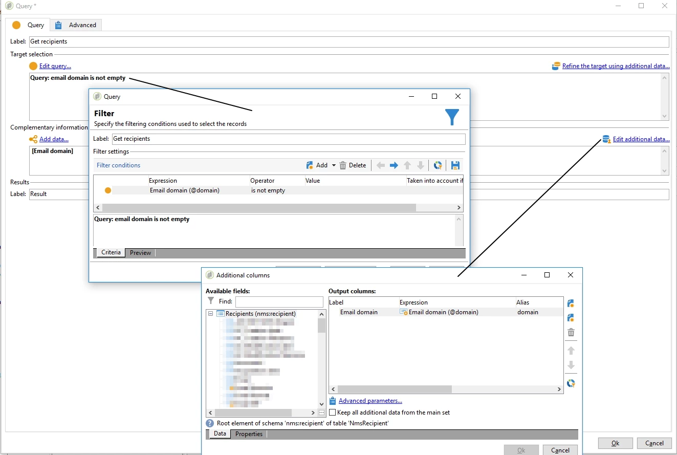 1. a query on recipients with email domain (@domain is not empty) -> Add data, column @domain, Alias domain