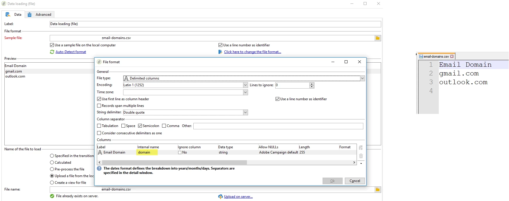 2. a data loading of the CSV, 1 column, internal name domain