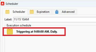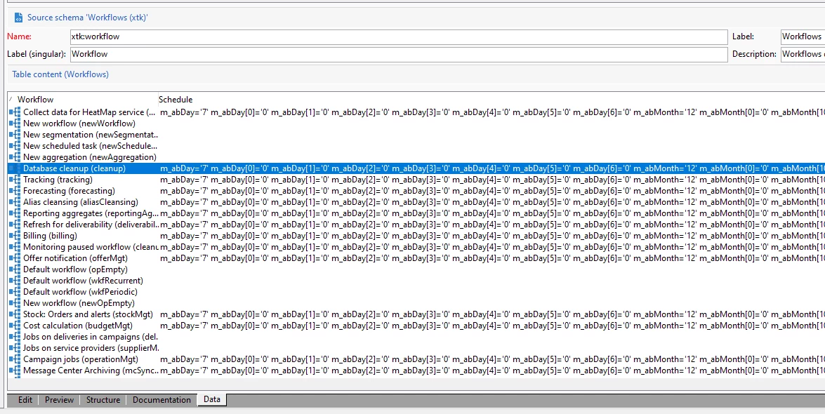 Hello, we are gathering data on all workflows in our Adobe Campaign instance and wish to include the execution schedule for workflows which have a "scheduler" activity, e.g. "Triggering at 9:00:00 AM, Daily". Please see attached screenshot. We have been unable to identify a field in the workflow activities schema that provides this string which is shown in the "scheduler" activity.