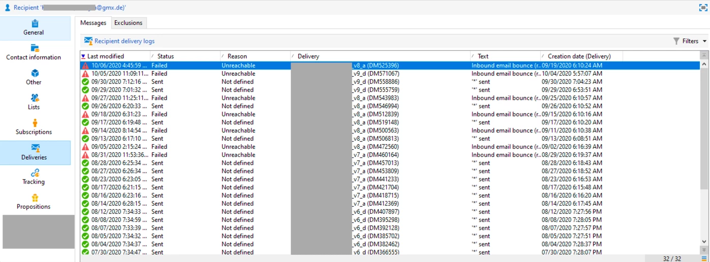 What we don't understand is why the delivery started on 09/19/2020 (first line on the screenshot) has been modified in the delivery logs on 10/06/2020 - which is 17 days after the sendout of the delivery. In the settings of the delivery template the option is set to "Delivery duration: 5d", so from my understanding the delivery logs shouldn't be updated any more after those 5 days?