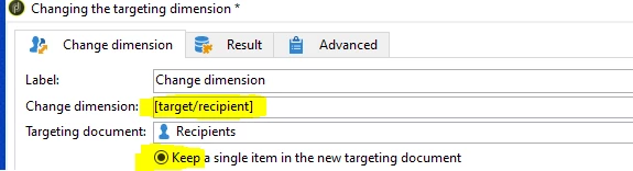 2. Then use change dimension activity to switch to recipient. It is important to select single records.