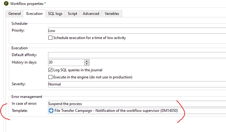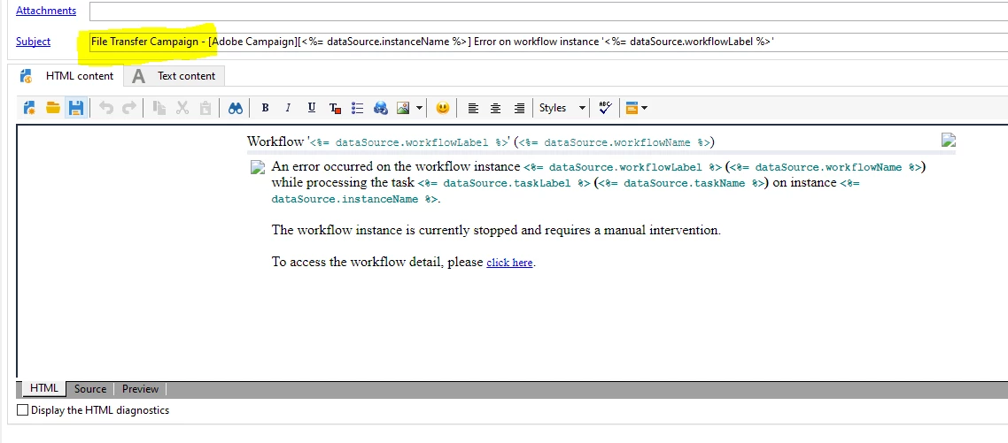 And modify the subject line as 'File Transfer Campaign - [Adobe Campaign][<%= dataSource.instanceName %>] Error on workflow instance '<%= dataSource.workflowLabel %>'