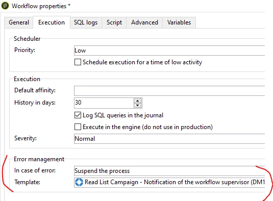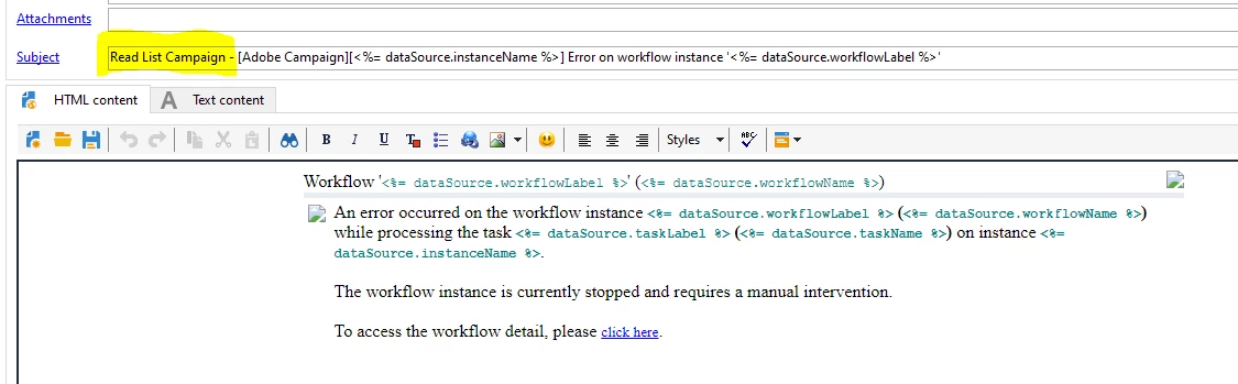 And modify the subject line as 'Read List Campaign - [Adobe Campaign][<%= dataSource.instanceName %>] Error on workflow instance '<%= dataSource.workflowLabel %>'