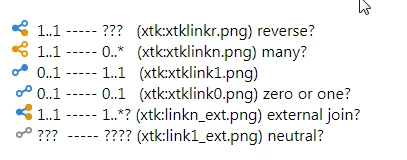 I'm looking for a description of each of the different icons that are used for representing the links between schemas. There is nothing in the Campaign Classic documentation that describes what the links represent. There is of course the 2 most obvious ones, which are the blue one-to-one link and the orange one-to-many link, but there are others that are less common. For example a grey link that looks like the one-to-one link, the blue and orange one-to-many link. Is there information somewhere in that provides the description of all the possible link types?