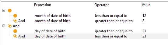 day of date of birth of targeting dimension greater than or equal to 23 and month of date of birth of targeting dimension greater than or equal to 8