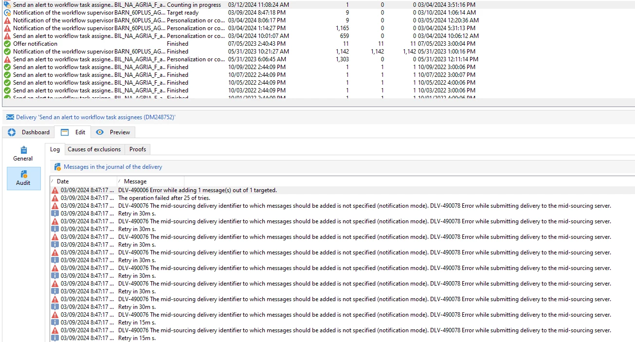 Hello, in our test enviroment the delivery for alerts to workflow task assignees doesn't work from a couple days ago. We had an issue with the certificate not being renewed so we couldn't send any email via our routing mid sourcing system, but we solved that so we are able to connect successfully to the midsourcing and we are able to send ordinary emails. But the "Alerts" doesn't works still and gives us this error. Not sure how to solve this: