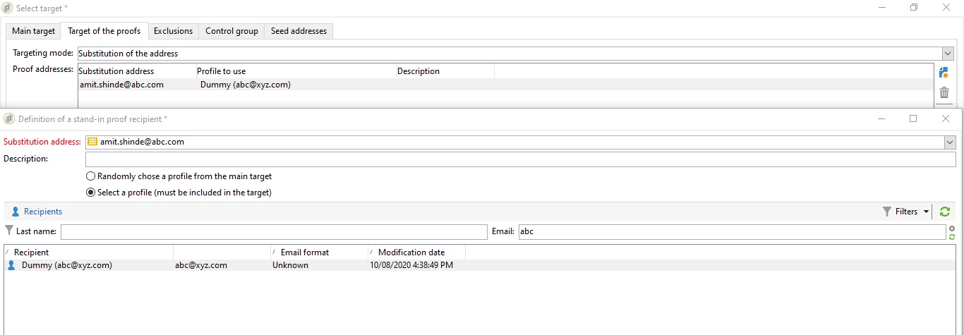 I have tried to enable "Inlcude proof targets in main target" and fill out "Profile to use" with a specific recipient for the substitution, but it applies a Random profile to use instead.