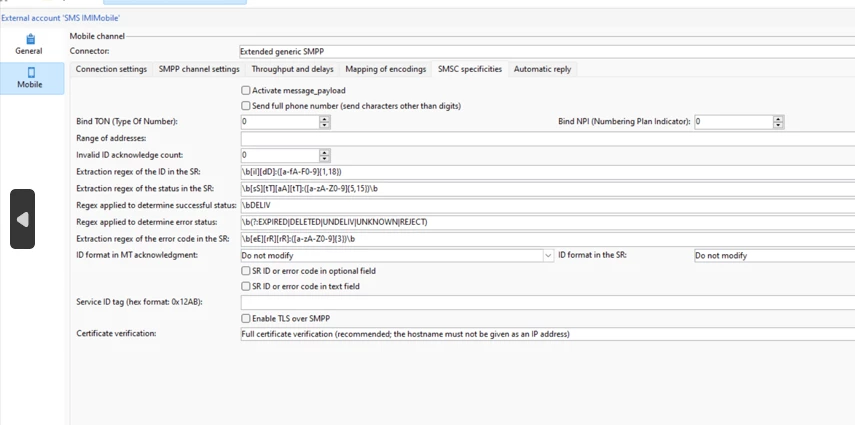 The above is the SMS connection settings for one of our clients who are on a hybrid mid-sourcing build.