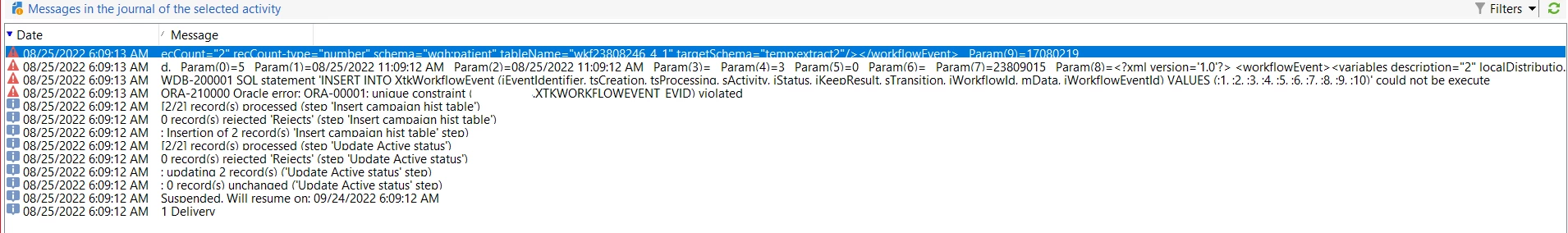 ORA-210000 Oracle error: ORA-00001: unique constraint ( XTKWORKFLOWEVENT EVID) violated WDB-200001 SOL statement ‘INSERT INTO XtkWorkflowEvent (iEventidentifier. tsCreation. tsProcessina, sActivitv, iStatus. iKeeoResult. sTransition, iWorkflowld, mData. WorkflowEventld) VALUES
