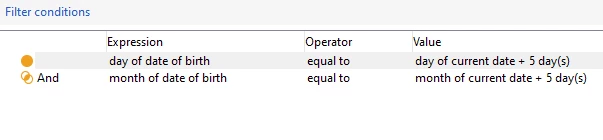 Day(@birthDate) EQUAL TO Day(AddDays( GetDate() , 5))