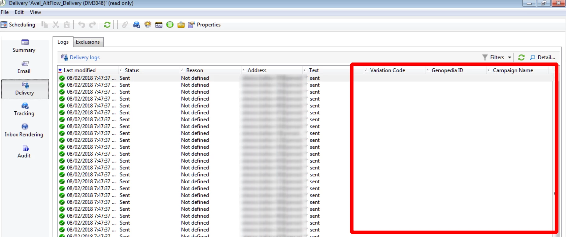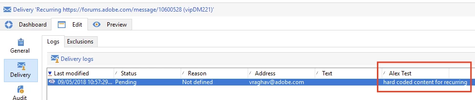 and it might also be useful to mention that my variable names are correct, for instance in the delivery subject line I print out '<%= targetData.persadoVariationCode %>' and it's there.