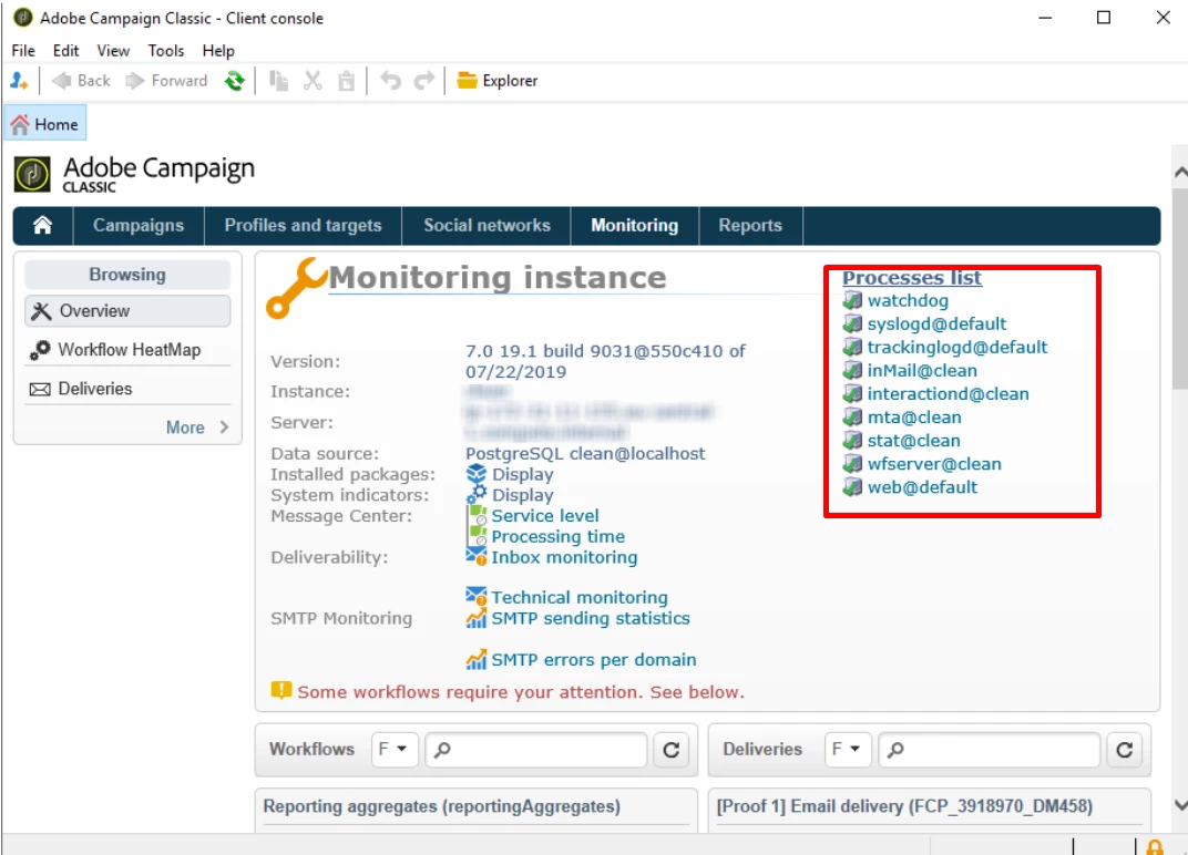 You can also go to Monitoring and click the Overview link to display the Adobe Campaign process monitoring page.