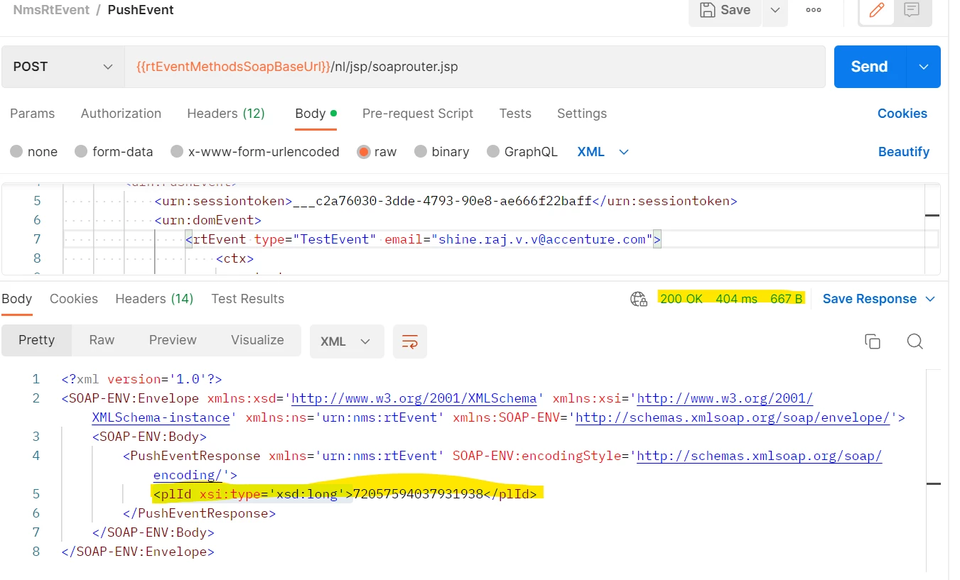 I have separate login collection in post man one for (session token and security token) and the other for push event from the (WSDL File of nms:rtEvent). Where i am manually making use of the (session token and security token) from the login SOAP API call and then calling the Push Event to send the Email from post man,