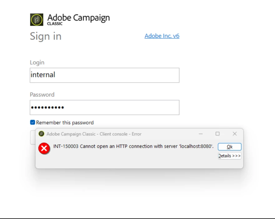 It looks like the campaign server is not running. On the server instance start the Adobe Campaign services to fix this .