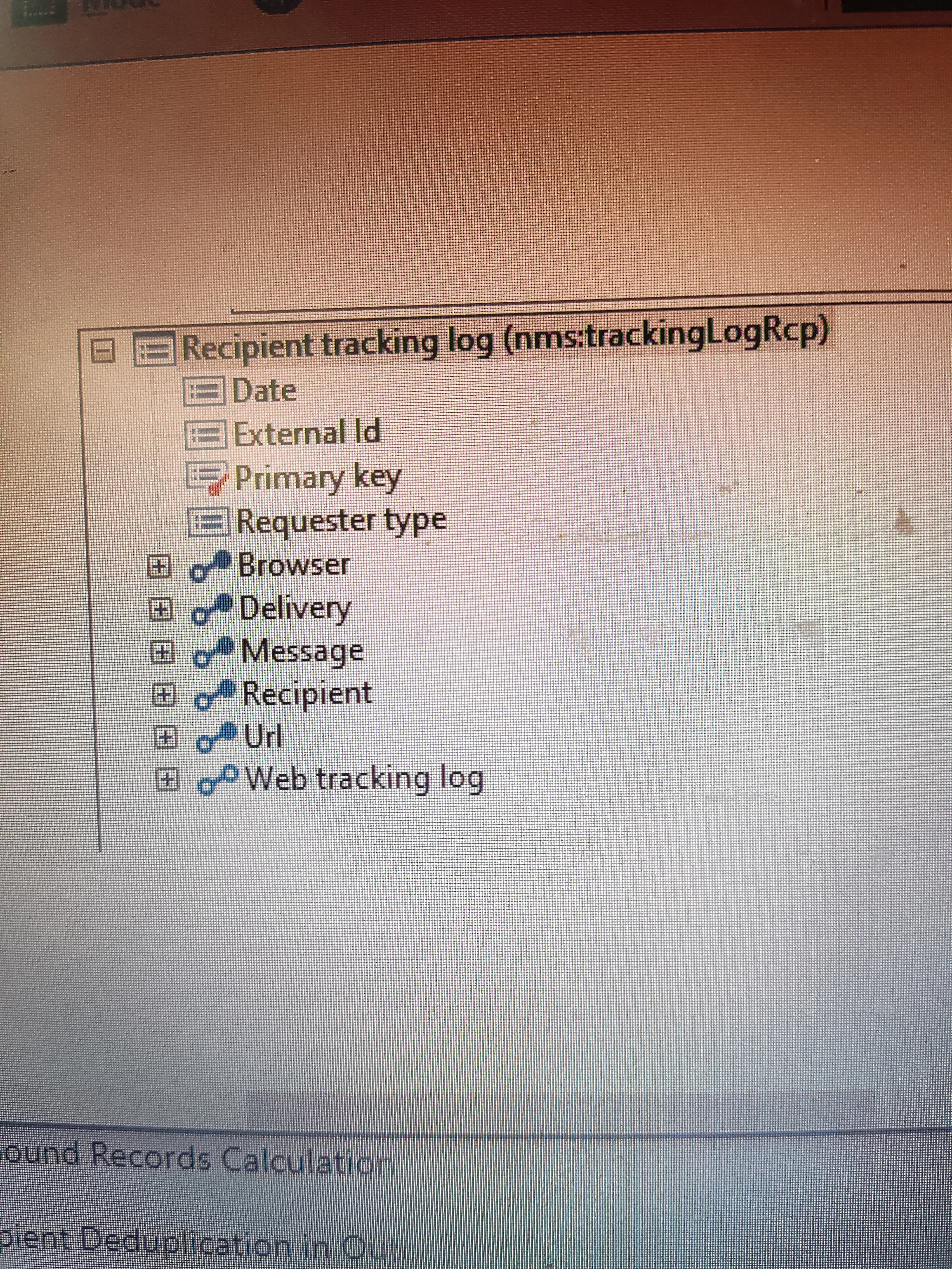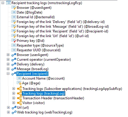 1. In the Tracking Log (nms:trackingLogRcp), the relationship between the recipient and the tracking log appears as 1-1.