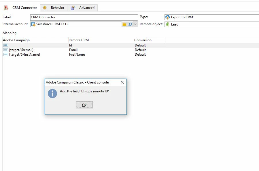 We are trying to export data from Adobe Campaign V7 to Salesforce using CRM connector.