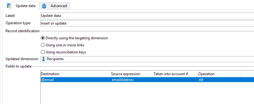 How to update schema using update data activity where input for update data activity should be result of javascript code?