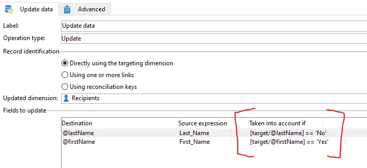 The issue I'm running into is that when I set up the Update Data Activity it's updating both fields as per my input of destination and source expression. I can't use a Split (to filter) the Text1 and Text2 fields as those are empty in the recipients table, but is it possible to have the Update Data Activity "read" the file and only update the appropriate destination if it's either "yes" or "no"?