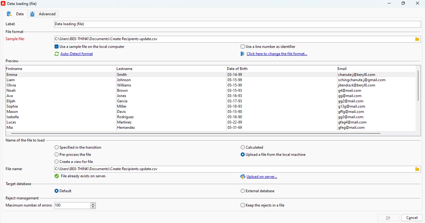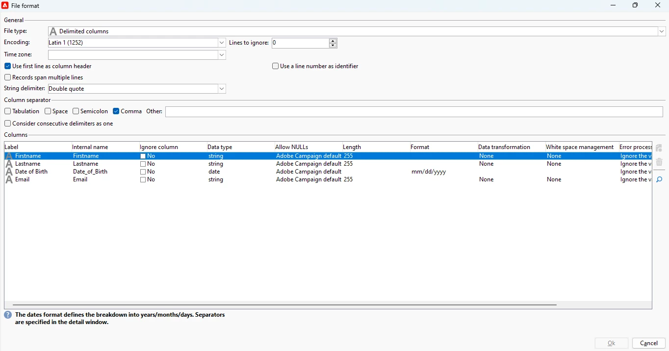 I would like to load a CSV File into Adobe Campaign so that I have an updated Recipients lists. The Fields are as follows :Firstname, Lastname, Date Of Birth, Email. How do I upload the whole CSV file into Adobe Campaign Classic so that these CSV file can are available in Recipients. Any guidance or screenshot would be greatly appreciated.