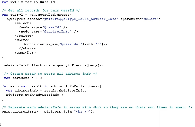 We have a need to use a variable inside of a delivery which is being generated by using the .js API to query a data table containing advisors and their assigned wholesalers, then create an array of the advisors and include that in a delivery to each wholesaler. How can we include this array inside the delivery? Since it is dynamic & a different array of advisors for each wholesaler (the delivery recipients), I don't believe the built-in delivery variables can accommodate. We attempted to use Personalization Blocks but it appears those aren't capable running queries & returning the results as variables. Working JS snippet attached... now we are just trying to figure out how to carry the advisorArray into the delivery. Any suggestions are appreciated.